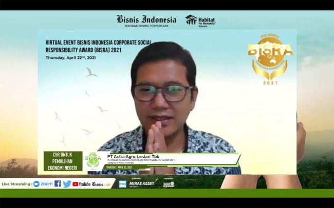 PT Astra Agro Lestari Tbk kembali meraih penghargaan berkat program-program Corporate Social Responsibility (CSR) yang dijalankan. Dalam event Bisnis Indonesia Corporate Sosial Responsibility Awards (BISRA) 2021 perusahaan perkebunan kelapa sawit ini meraih penghargaan kategori Platinum untuk perusahaan Publik. Penghargaan tersebut diserahkan melalui kegiatan yang diselenggarakan secara ofline dan online oleh harian Bisnis Indonesia. “Good CSR…